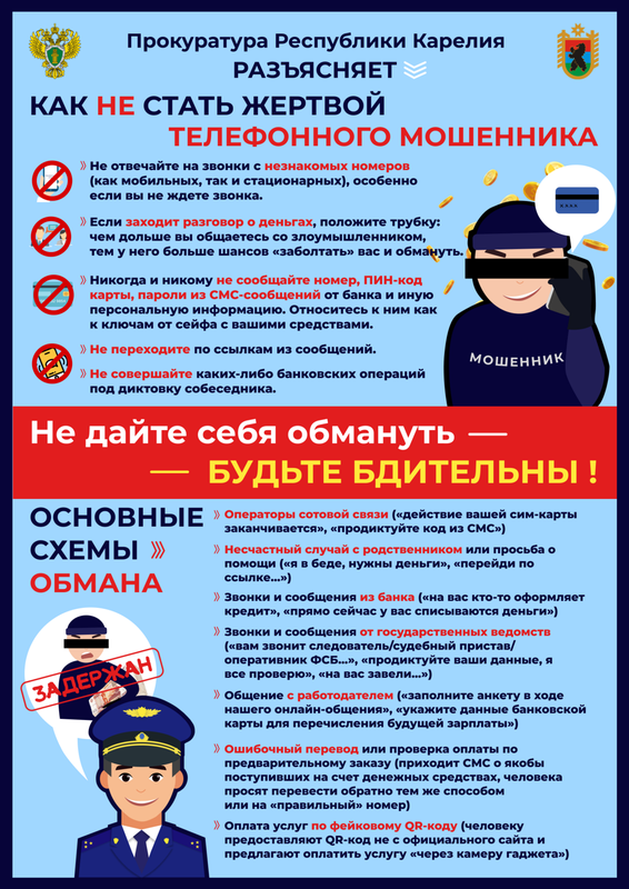 — не совершать денежные переводы по требованию «сотрудников» полиции, банков или госорганов, если они не были проверены официально.